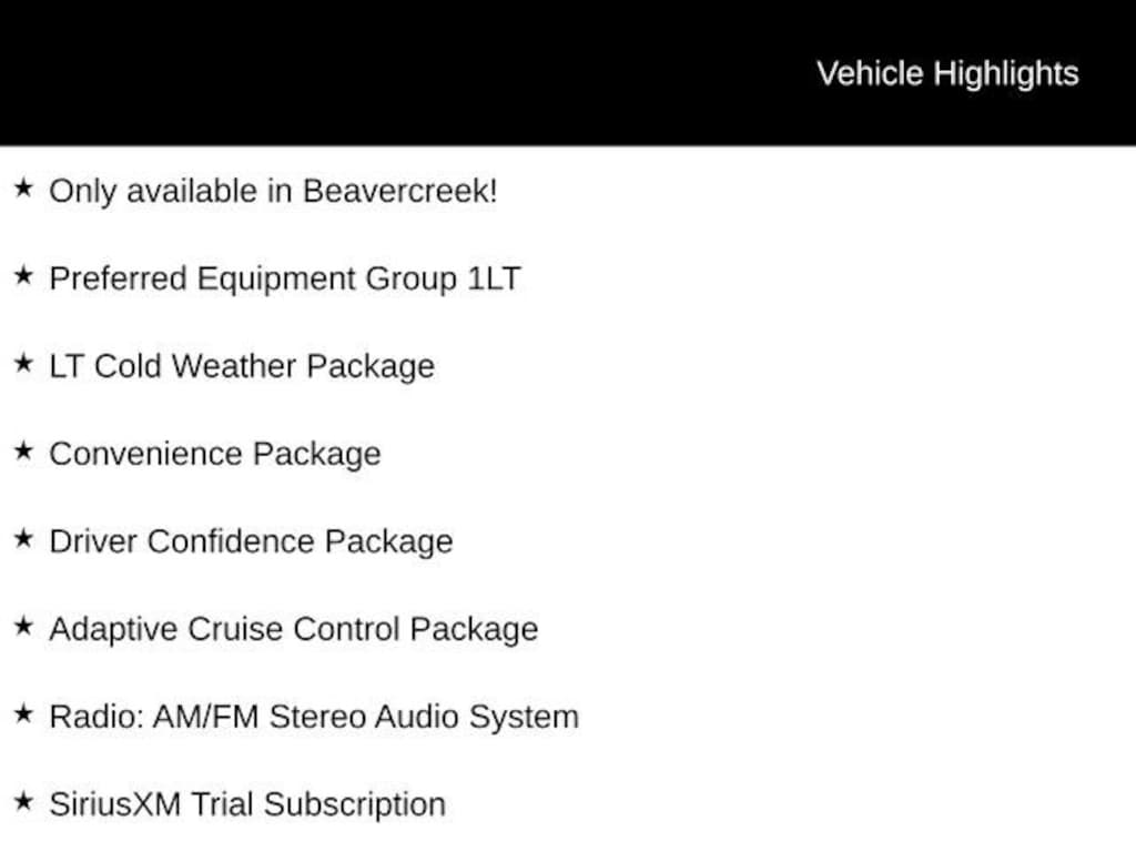 Only available in Beavercreek!, 1 Type-A & 1 Type-C USB Charging-Only Ports, 1 Type-A & 1 Type-C USB Ports, 120-Volt Power Outlet, 2-Way Power Driver Lumbar Seat Adjuster, 8-Way Power Driver Seat Adjuster, Adaptive Cruise Control, Adaptive Cruise Control Package, Convenience Package, Driver Confidence Package, Heated Driver & Front Passenger Seats, Heated Steering Wheel, Inside Rear-View Auto-Dimming Mirror, Lane Change Alert w/Side Blind Zone Alert, LT Cold Weather Package, Power Liftgate, Preferred Equipment Group 1LT, Radio: AM/FM Stereo Audio System, Rear Cross Traffic Alert, Rear Park Assist, Single-Zone Automatic Climate Control, SiriusXM Trial Subscription, Wheels: 18 High Gloss Black Machined Aluminum, Wireless Charging. 29/33 City/Highway MPG