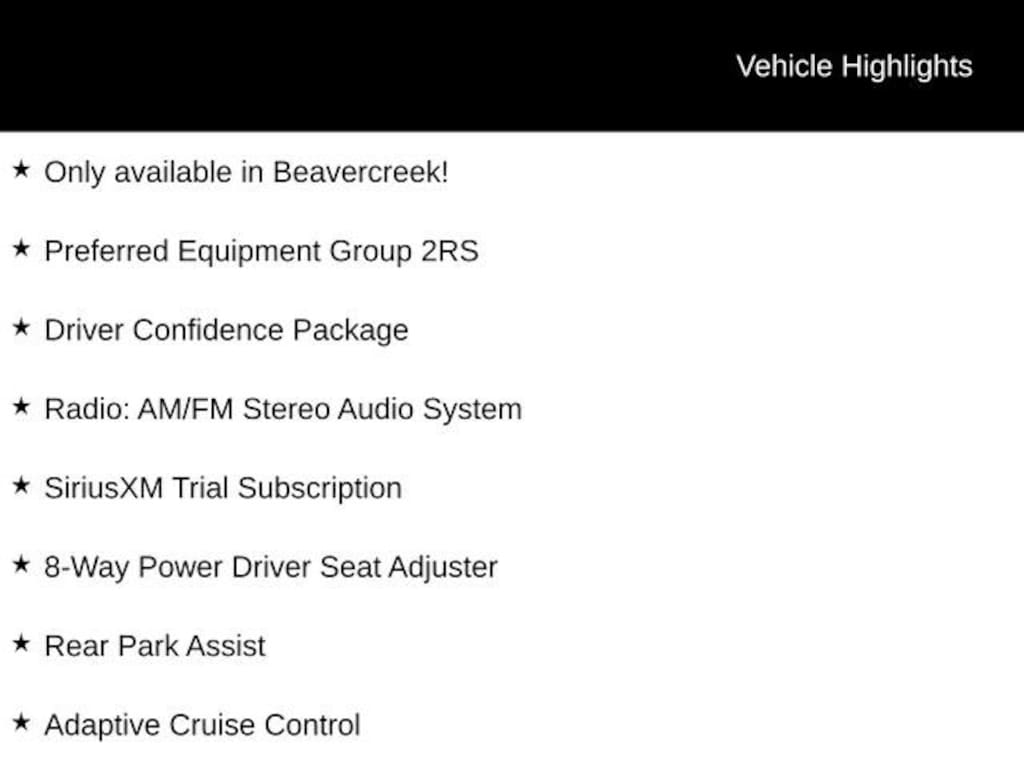 Only available in Beavercreek!, 2-Way Power Driver Lumbar Seat Adjuster, 8-Way Power Driver Seat Adjuster, Adaptive Cruise Control, Driver Confidence Package, Heated Driver and Front Passenger Seats, Heated steering wheel, Lane Change Alert with Side Blind Zone Alert, Preferred Equipment Group 2RS, Radio: AM/FM Stereo Audio System, Rear Cross Traffic Alert, Rear Park Assist, SiriusXM Trial Subscription, Wheels: 19 Black-Painted Machined Aluminum, Wireless Apple CarPlay/Wireless Android Auto. 28/32 City/Highway MPG